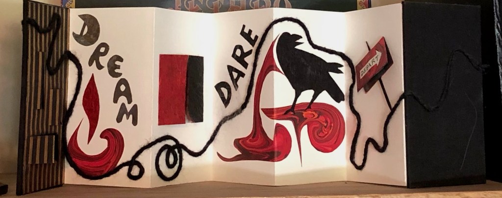 > I’d forgotten that I’d made a follow-the-thread book for my son, but after he saw last Friday’s post he sent a photo. Here, as in last week’s book, between ‘Dream’ and ‘Dare,’ ‘Decide’ is printed in many different & enticing fonts — hidden behind double doors because, as you’ve no doubt figured out, deciding between all the wonderful possibilities can be a block to my process, a weak point in my thread. Then, at the end, ‘Depart’ opens to reveal ‘Dream’ because completion & letting go open up space for new dreams to appear & unfold. I’m posting his photo here because I like this book better than the one posted last week & because it includes Raven, that old Trickster who is an embodiment of human Creativity (for good or for ill) & who seems to keep popping up in my life