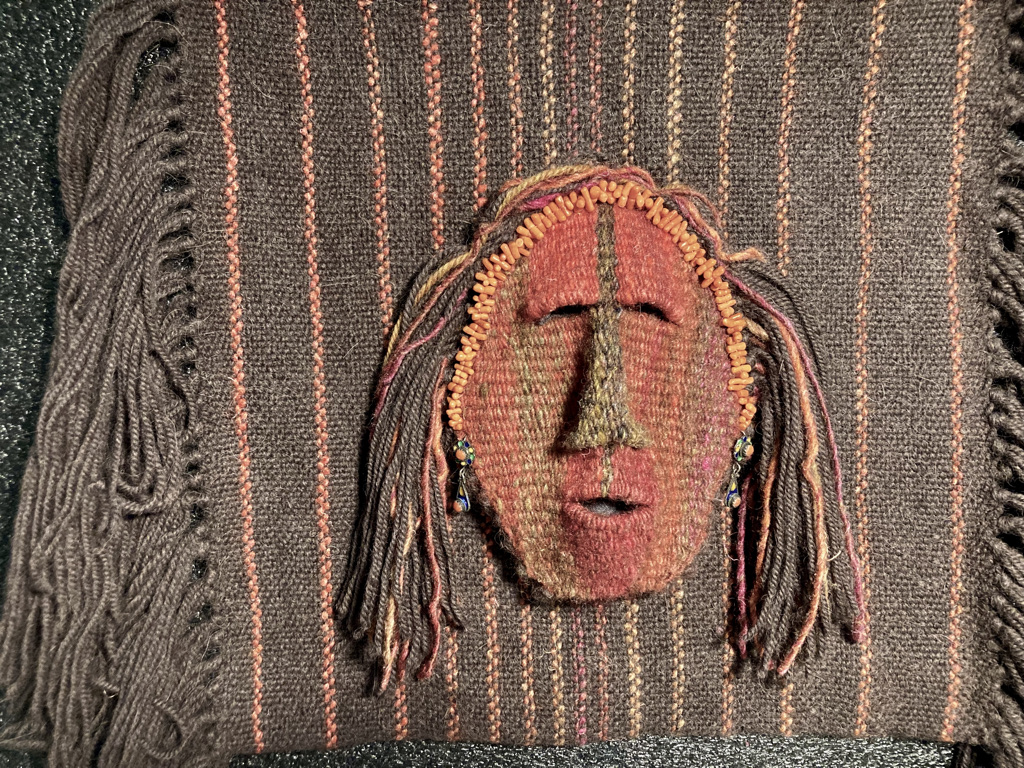 Several weeks ago, I thought I had finished with the Dreaming Towards Dawn mask, but she continued to seem unsettled, to want more. I tried this; I tried that…. Then last week I dreamed of her wearing a crown or headband of coral beads. When I woke up, I remembered the simple little necklace of coral beads I’d gotten in Mobasa, Kenya, in 1964. Its thread had broken many years ago and I always meant to restring it, but…. the beads ended up in a little box somewhere. And when I dug out that box, I found it under another little box containing small earrings I’d purchased in 1968 from a Tuareg woman near Tamanrasset in the Algerian central Sahara. They were enameled, with tiny coral beads set in the pattern. So — still not “done” (whatever that means) but getting to what will be the stopping point.