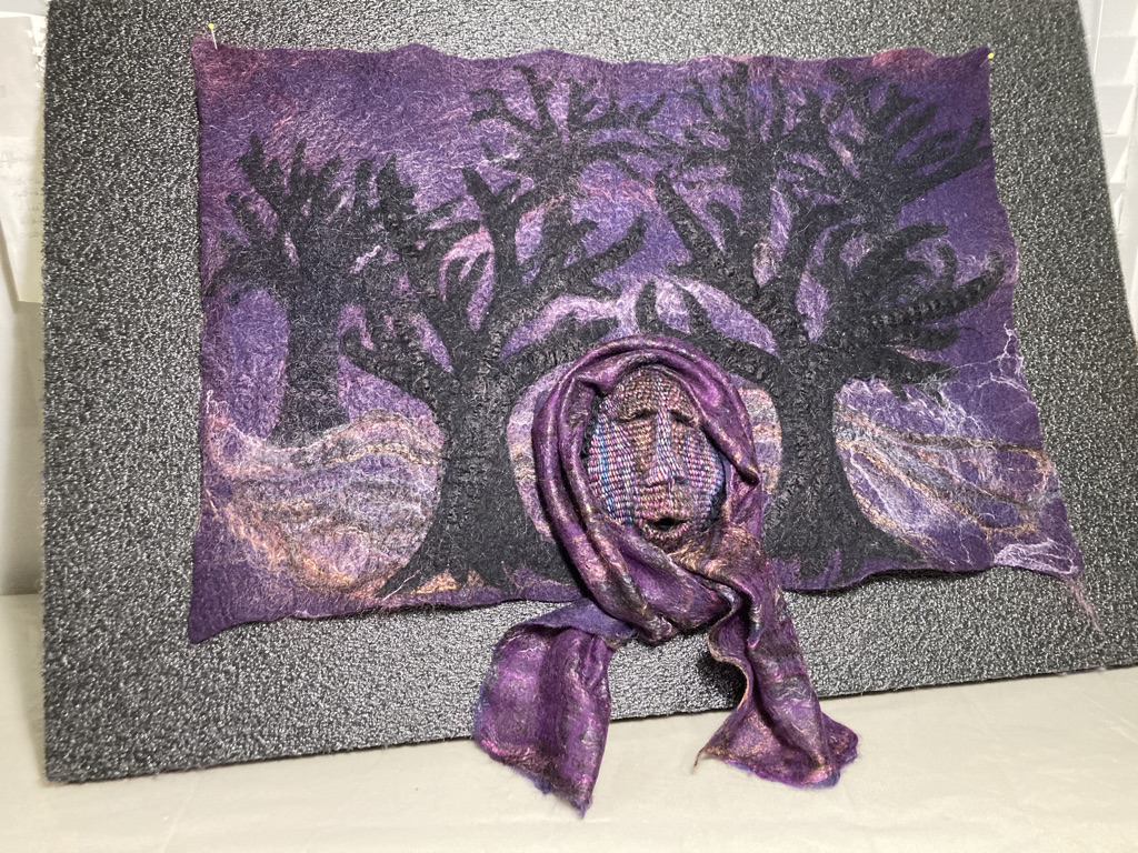 And after the Spirit of The Betwixt and Between asked to live in a twilight forest (see last week), I set out to make one for her. Then it seemed she needed some sort of wrap, so — after much experimenting — I made her a scarf. I still need to decide whether to use it and if so how. I almost see it as taking her to a whole new context (though that may be a thought for another mask & another time). In any case, she herself needs some further shaping. Oh, I discover so much as I go along with the flow! Great fun — and this is a good (though rather sobering) time to contemplate the meaning of Between-ness as I work.