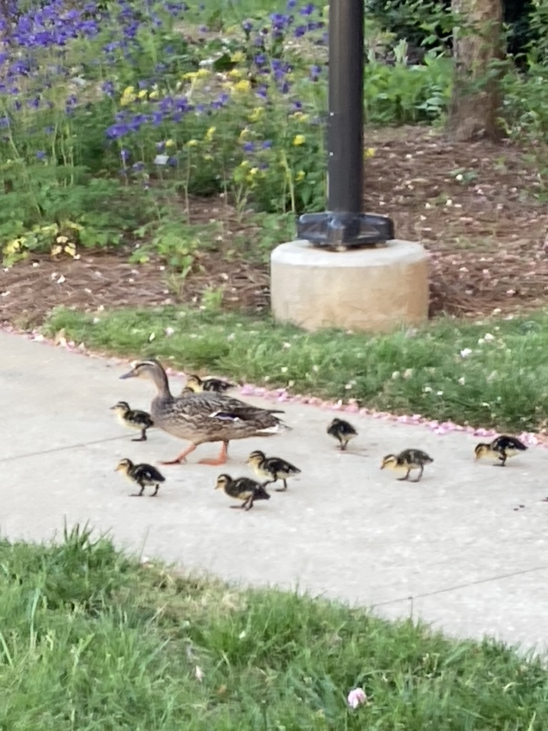 ducks going to the waterfall in inner courtyard, Friends Homes West, April 2024