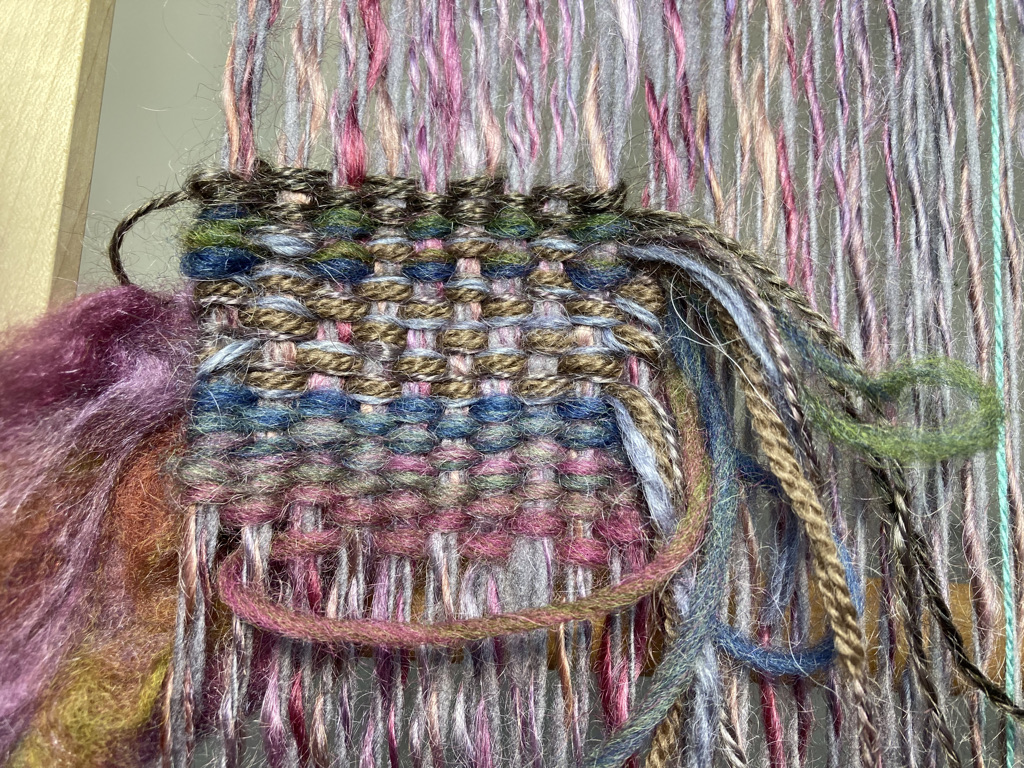 In the meantime, my dance with fiber & with Trickster continues. More than once I’ve wanted to make a dash to the yarn store to see if I could find a “perfect solution” to whatever issue of color or texture has arisen. But I decided at the start to use only the fibers & yarns I had on hand. That’s how Trickster works, incorporating whatever comes to hand in some marvelous feat of bricolage as he makes the world. And isn’t that how cosmological, geological, and biological evolution work, too — just trying out might be done with whatever is around in the circumstance of that moment?